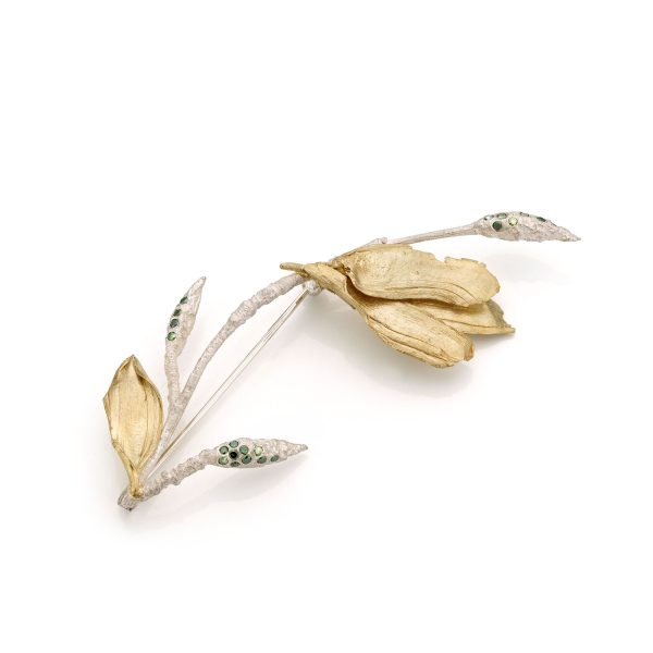 Omschrijving: De inspiratie voor deze broche vond ik in de natuur. De winter komt ten einde. De laatste dode bladeren vallen en de eerste groene knoppen komen tevoorschijn.